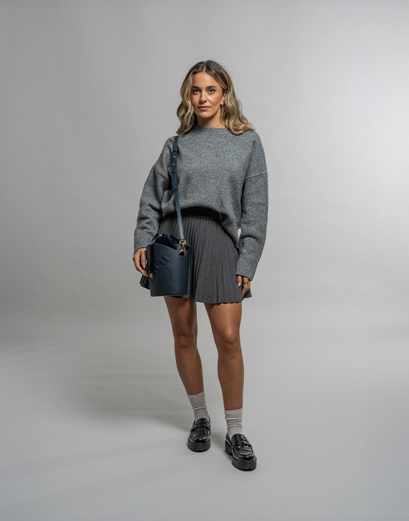 Pooch Chloé com letras em dourado em B-Light® (um composto de borracha perfumado) cor azul com nécessaire formato rebuçado em velvet cor azul. Inclui uma alça glamour azul ajustável de 116 cm.